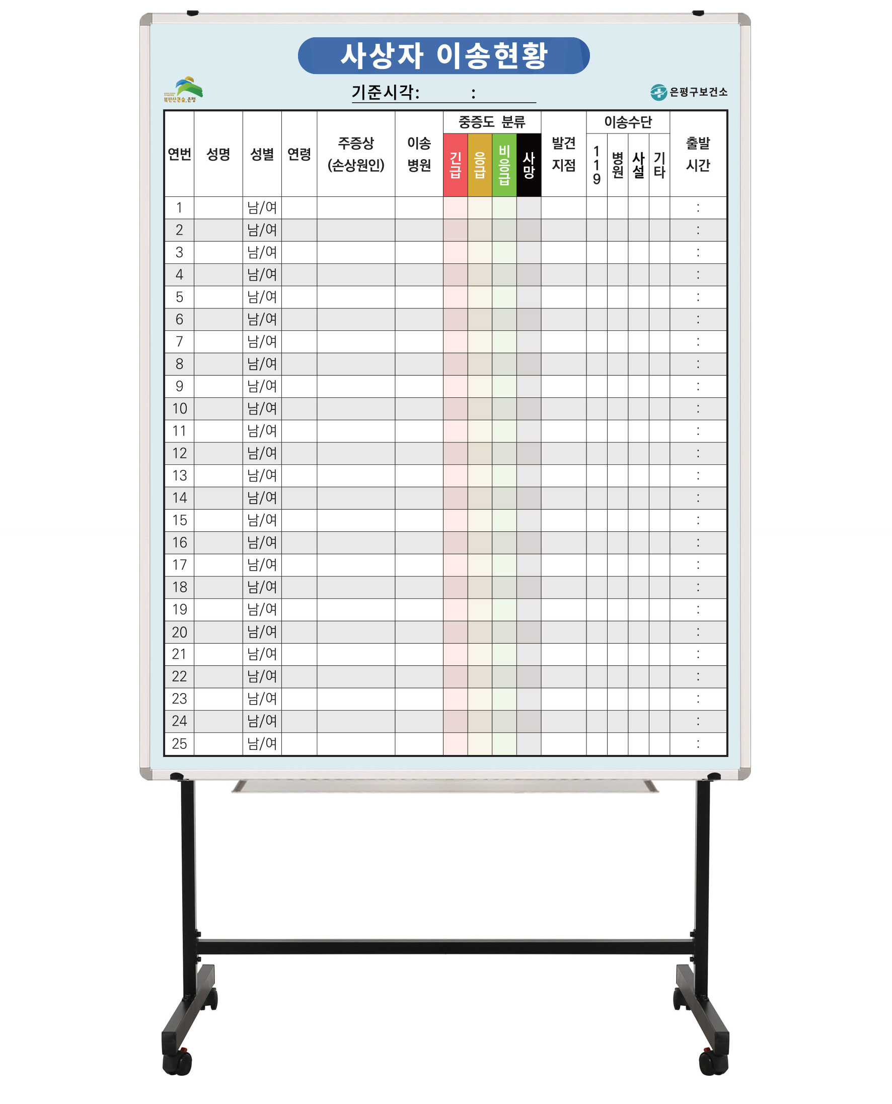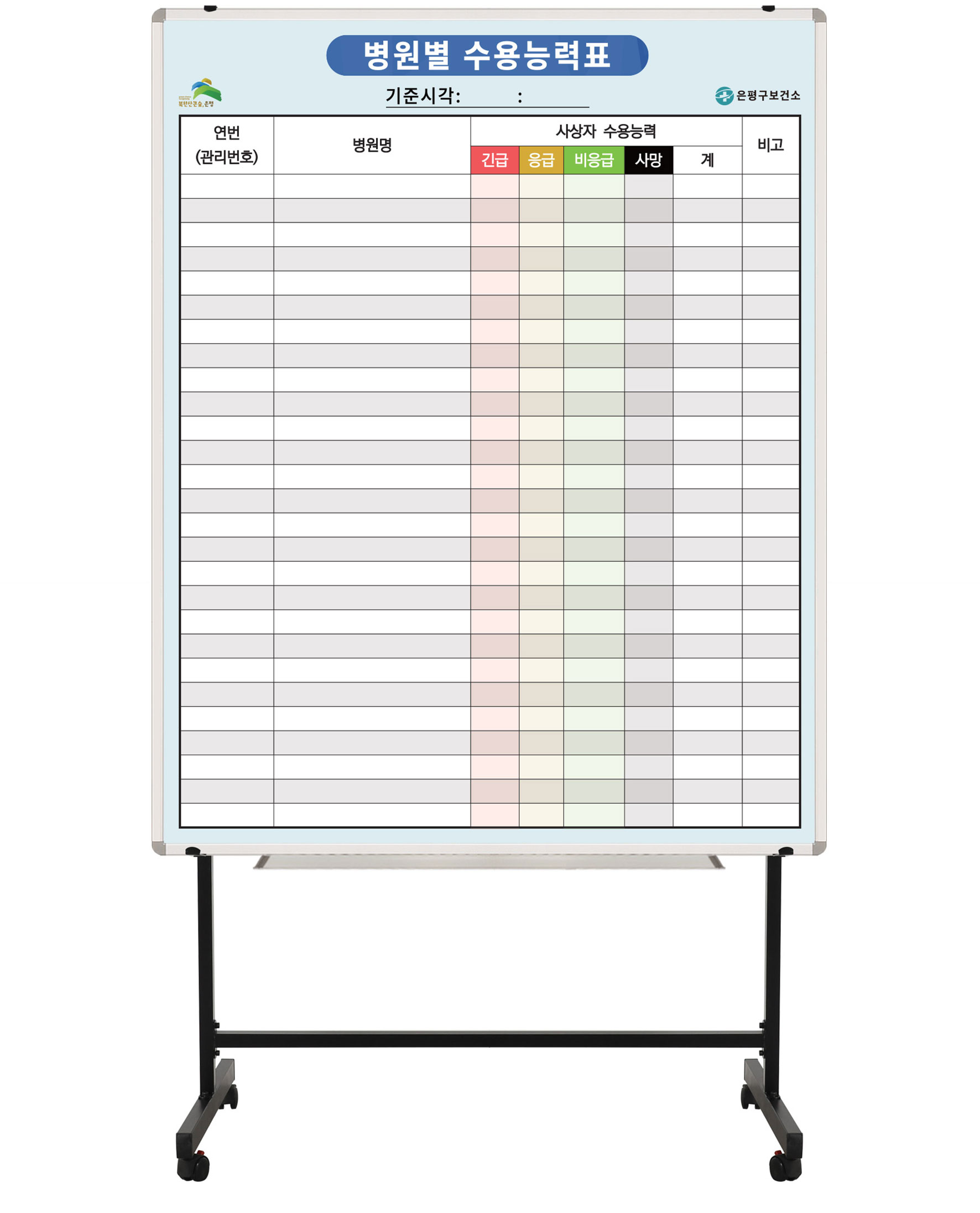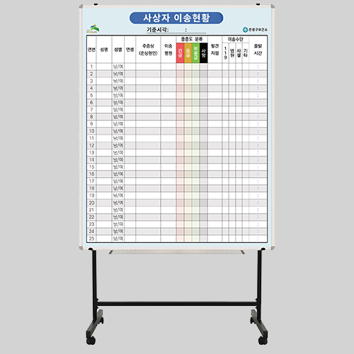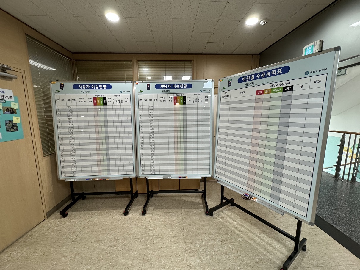 재난 상황시에 병원별 수용능력과 사상자 이송 현황을 한눈에 알아볼 수 있는 화이트보드를 제작하였습니다.