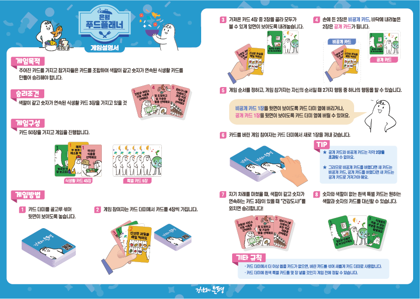 은평 푸드플래너 카드게임 제작을 위해 설명서와 게임 카드를 제작하였습니다.